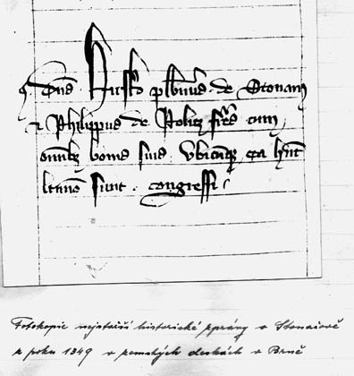 Fotokopie nejstarší zprávy o Stonařově z roku 1349 v zemských deskách v Brně